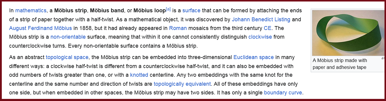 it is a single strip that is twisted a half turn and ends joined and so if an ant walked down center of strip it would cover all the surface .. it only has one continuous surface.