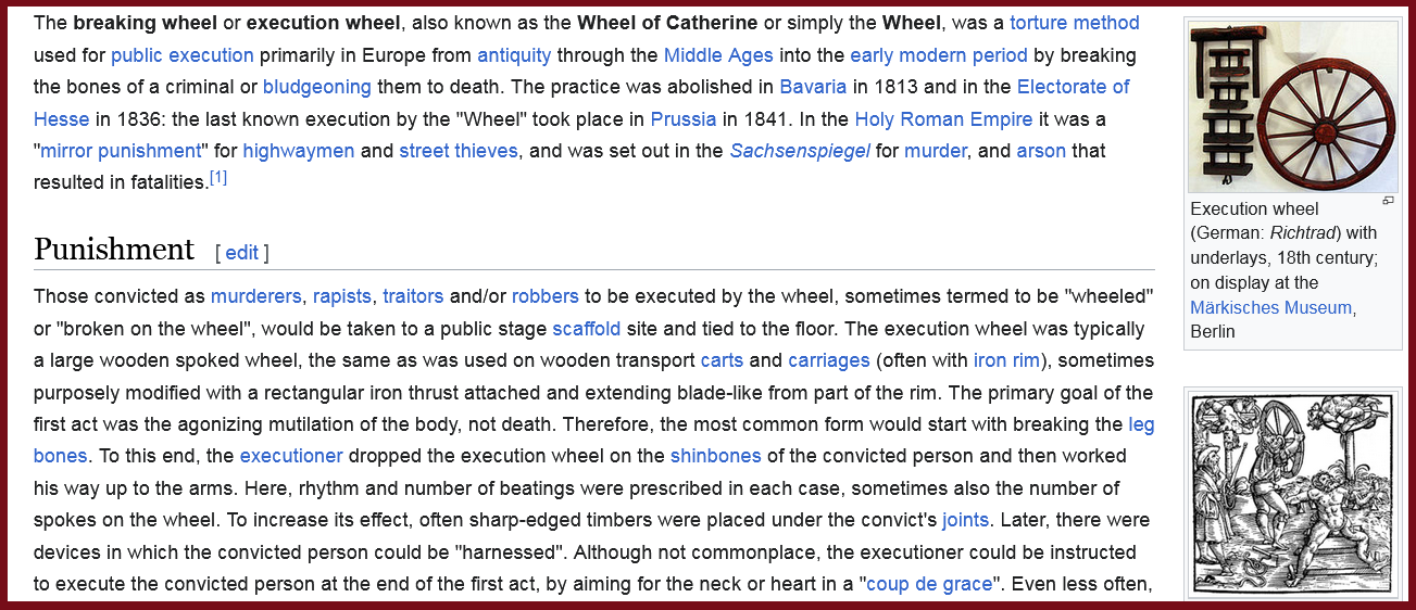 .. where a person is tied to an old-fashion wagon wheel and people – in public – use a baseball bat or similar to systematically break all the limbs of the person – and often once the limbs are useless the person is untitled and further tortured – unable to move away and any attempts cause the clearly broken and misshaped bone limbs to grind as the muscles spasm.