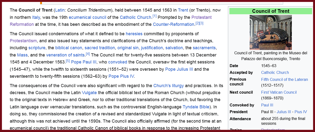 Instead - here is the Wikipedia for 'Council of Trent' (archived).