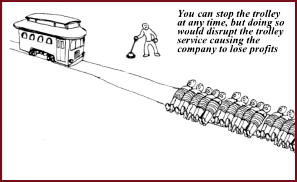 Much like what has been done to most of us from the crib, and made institutionalized in Education, Medical, and all Institutions large enough to be owned and directed by those corpDragons of international size more powerful then entire Nations, and those businesses and people who are under Threat of the lest being refusal or 'problems' in interacting with them – to much larger degrees including carpet-bombing with radioactive spreading bombs that Sicken for the span of humanity the regions - and such Evil corpDragons owned and controlled by Golden-Calf Satanic venture-capital Witches and minions (filled with enslaved elites & families members in Leadership and below) ..