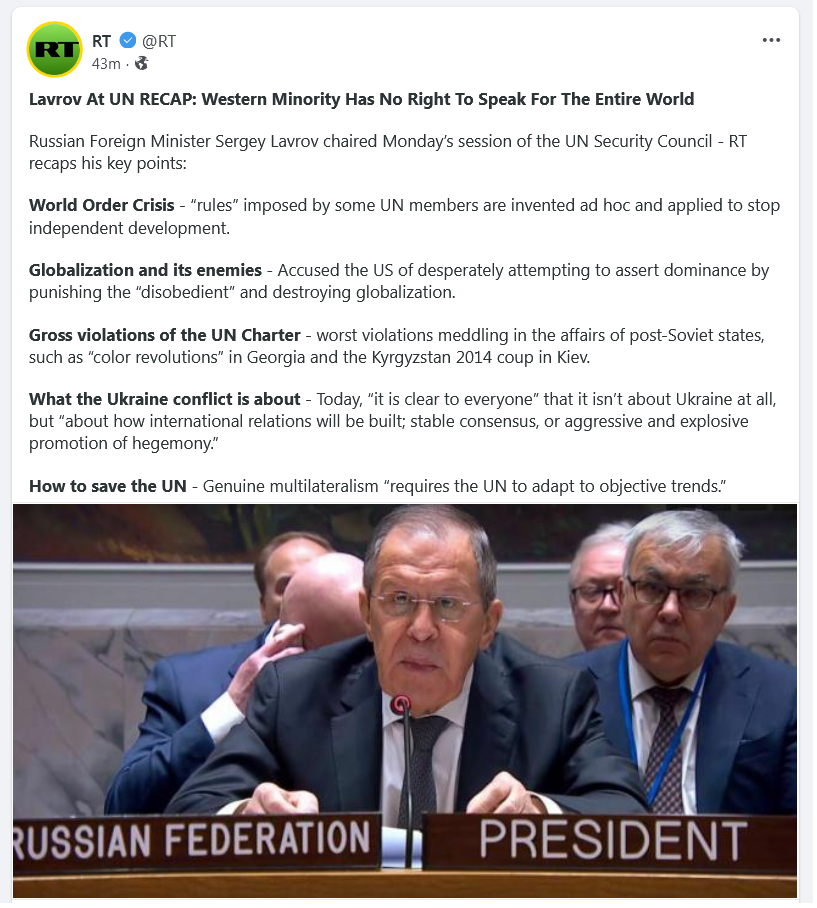 .. those that are clearly in control of such bodies as the UN (as the longer video of the Russian Lead meeting video I included yesterday displays and the contrast between the GreatSatan Empire which has major control (the Female-Evil unTrue, unJust, disOrdering war-death-horror-Hell GloboHomo Sin-Burning-in-Hell Genocidal goaled Body) in first delusional presentation displays, and the 2nd from the Russian – the more rational and True version.