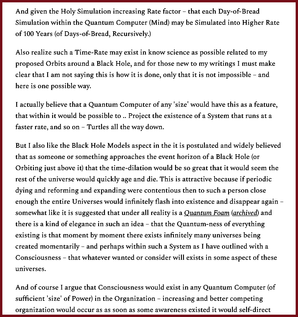 .. Recall my example of one Possible way Science as we know it now allows such rate changes as possible – that is a sequence of the same Computer-Satellites in Orbit or spiraling down into a Black Hole , all in communication with each other – at least up the chain – and in Service to each other where those further away and so running much faster are willing to do the tasks of those lower (Holy Value Limits and Scope-Limits Apply) each able to run Simulations .. perhaps AI based on actual People who have died and been processed into Quantum Computers – Brain-in-Boxes – in part through Mapping of their Brian Structure to the molecule level when possible and Interpolation and [Holy] Neural Network reproduced and reconnected .. as an Apologetic Scientific Suggest part of a Model of the Holy, ..