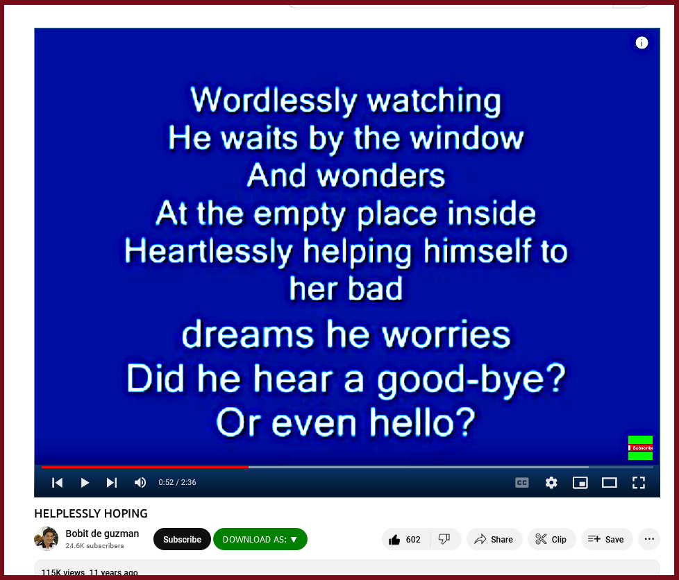 A good song – I have not listen to [this] YouTube playlist with this song in a while .. a lot of good other tunes, also.