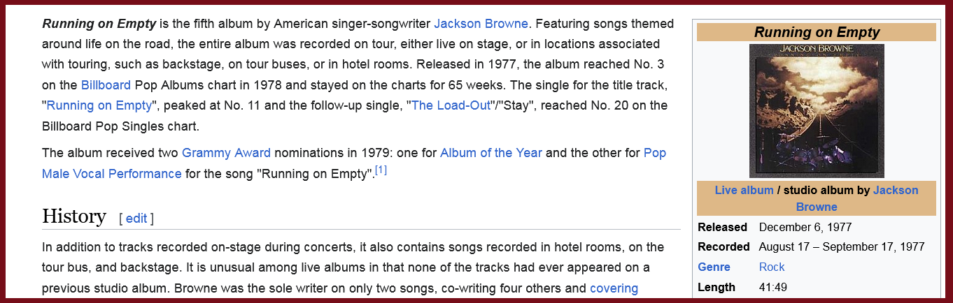 I had one of this albums – Running on Empty (archived) – which was good but I went a long time before discovering his many other – even better – work, perhaps from earlier and before mercantilism came into play – music as a Product and concerts as a Product?