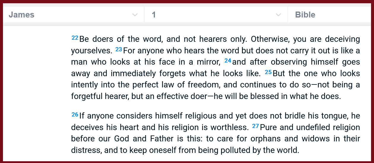 "22Be doers of the word, and not hearers only. Otherwise, you are deceiving yourselves. 23For anyone who hears the word but does not carry it out is like a man who looks at his face in a mirror, 24and after observing himself goes away and immediately forgets what he looks like. 25But the one who looks intently into the perfect law of freedom, and continues to do so—not being a forgetful hearer, but an effective doer—he will be blessed in what he does.