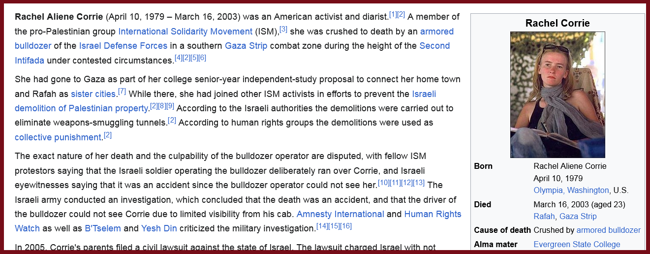 Those israeli bulldozers will kill 'soulless-goys' without reprisals when destroying indigenous population homes – American Rachel Corrie (archived) was murdered by one, and like the USS Liberty (archived) murders, ..