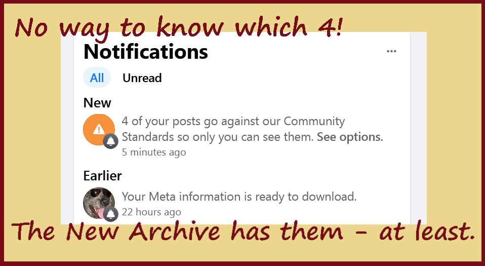 The full Facebook Archived till 31 May 2023 that Facebook produces on request of posts and 'comments' which mostly contain the cross post reference information (although not easily linked!) is now on DropBox and the links are below after the PS – for those 'comping at the bit' to feed your Pet AI s.