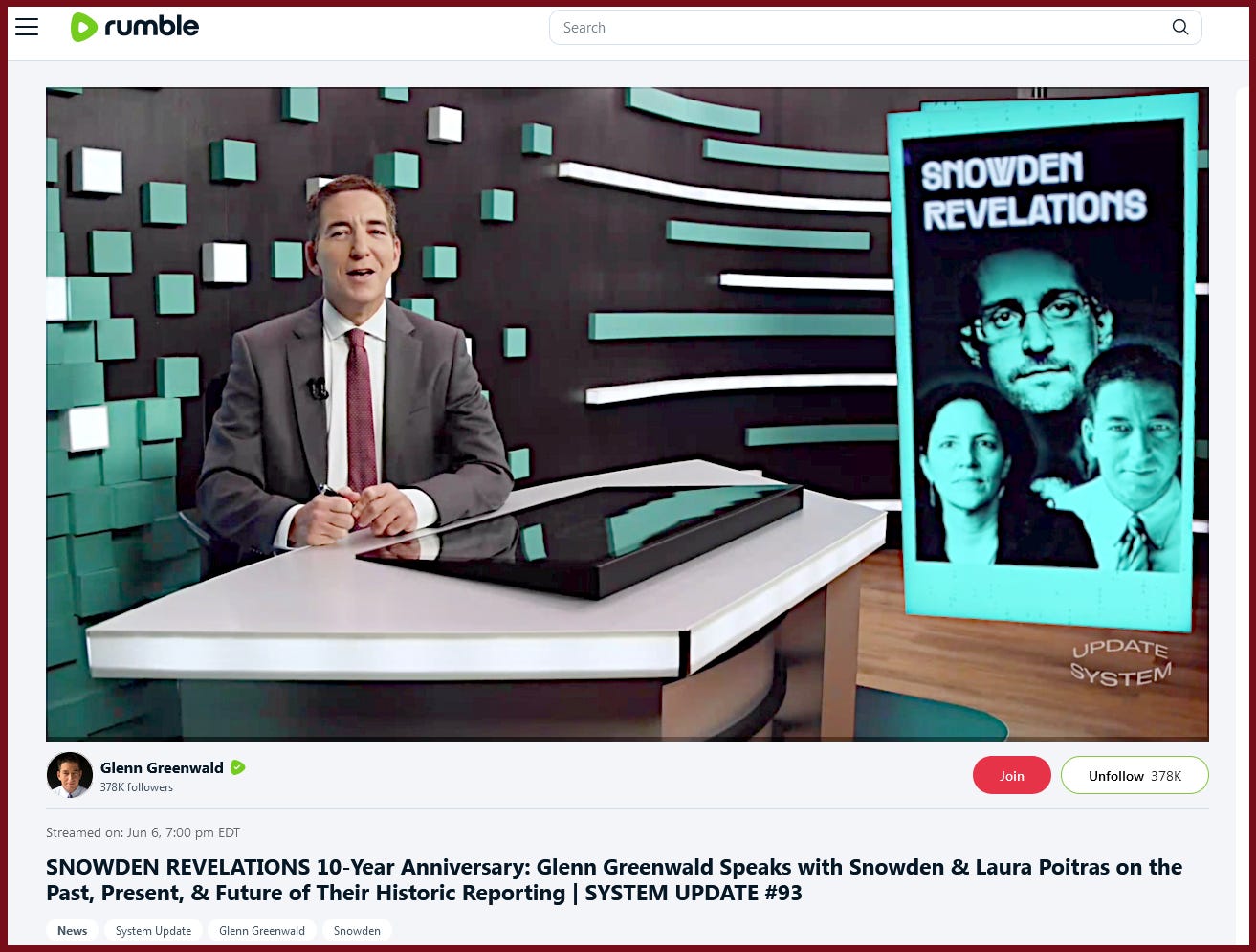 “SNOWDEN REVELATIONS 10-Year Anniversary: Glenn Greenwald Speaks with Snowden & Laura Poitras on the Past, Present, & Future of Their Historic Reporting | SYSTEM UPDATE #93”