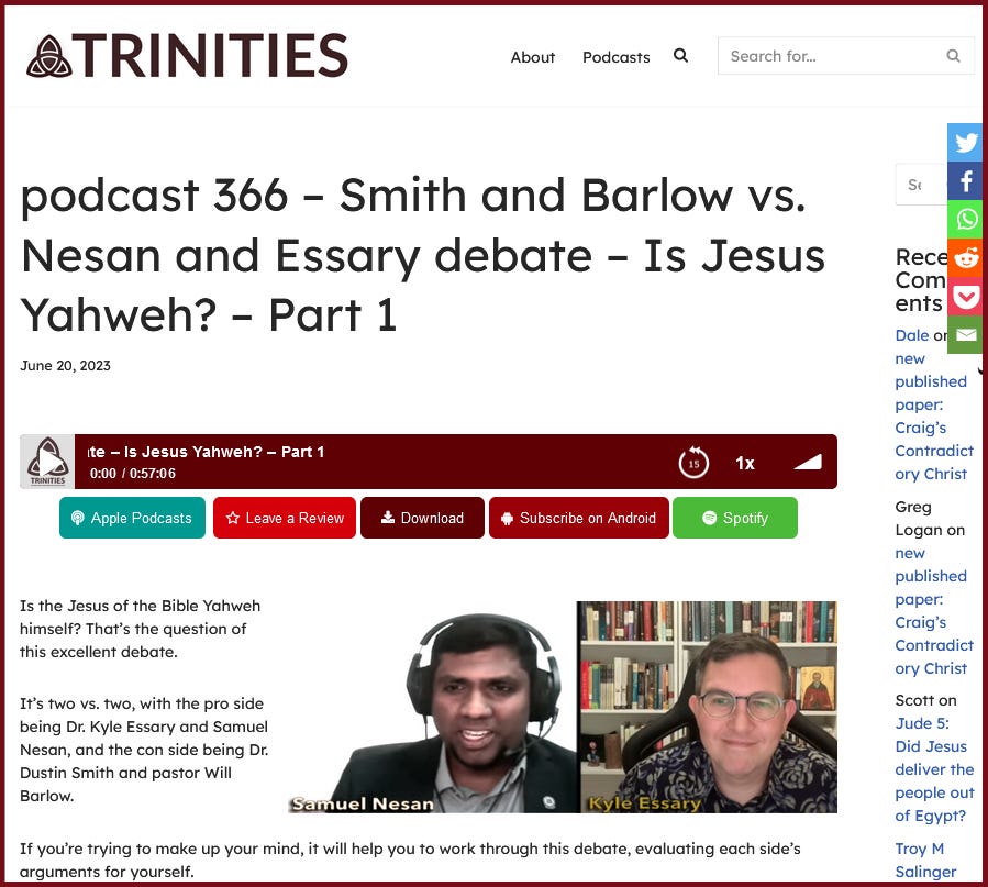 “podcast 366 – Smith and Barlow vs. Nesan and Essary debate – Is Jesus Yahweh? – Part 1”