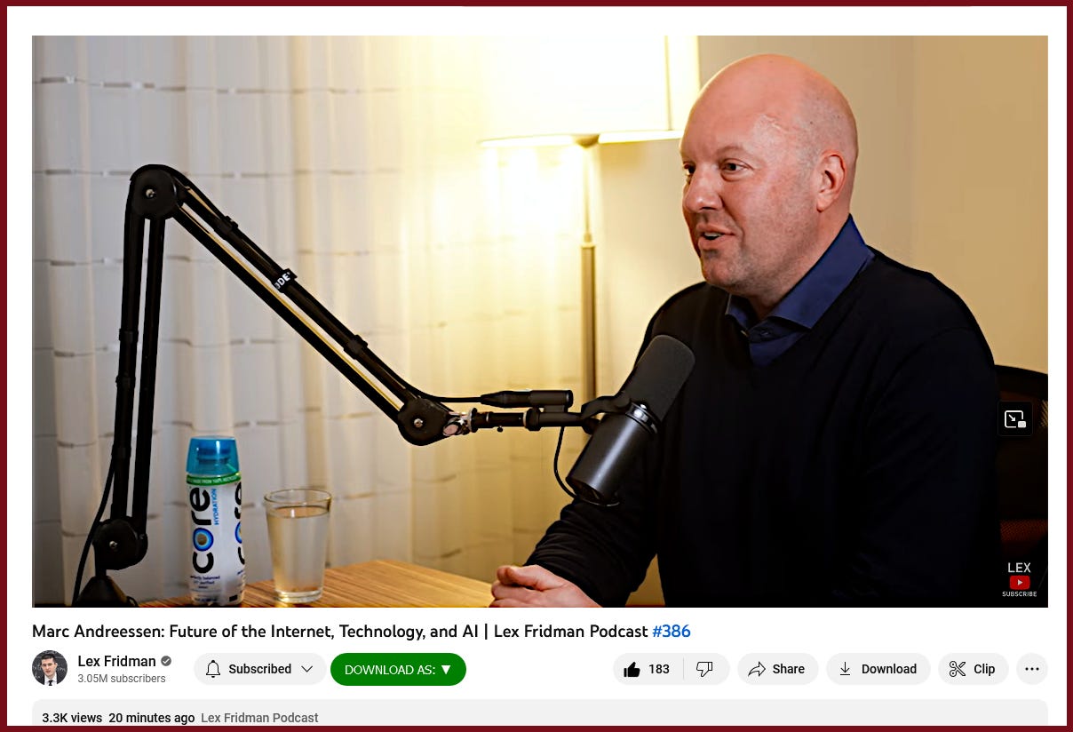 “Marc Andreessen: Future of the Internet, Technology, and AI | Lex Fridman Podcast #386”
