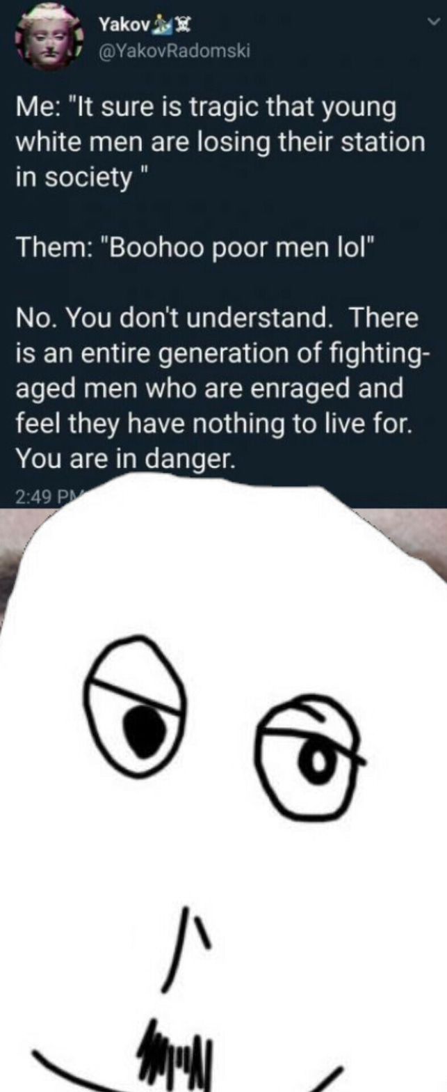 So the man says .. ' .. You have excluded the white men who have push-back and expanded society through history .. so you can F-ing die under those women and diversity hires .. and I will laugh my ass-off while you burn in your crashed plane, ..'