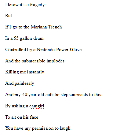 With an Ego Death in my recent memory – the Understanding of the Level of Betrayal of Women in society and especially my mothers and all those I knew and believed either had a personal reason to want Good for me, or where Professionally and-or Morally Obligated, and only the realization that such was Standard evil against the male – coordinated Horror – that prevented me from lumping my Fathers and many many other men who I know and Knew would have explained and Helped me because unlike most Mind-Broken Rationality-destroyed pro-baby-murders and supporters (and other insanities) that Harmed them into an in ability to Love anymore – in general – Men still generally have that Grace, and will and do exercise it often., ..