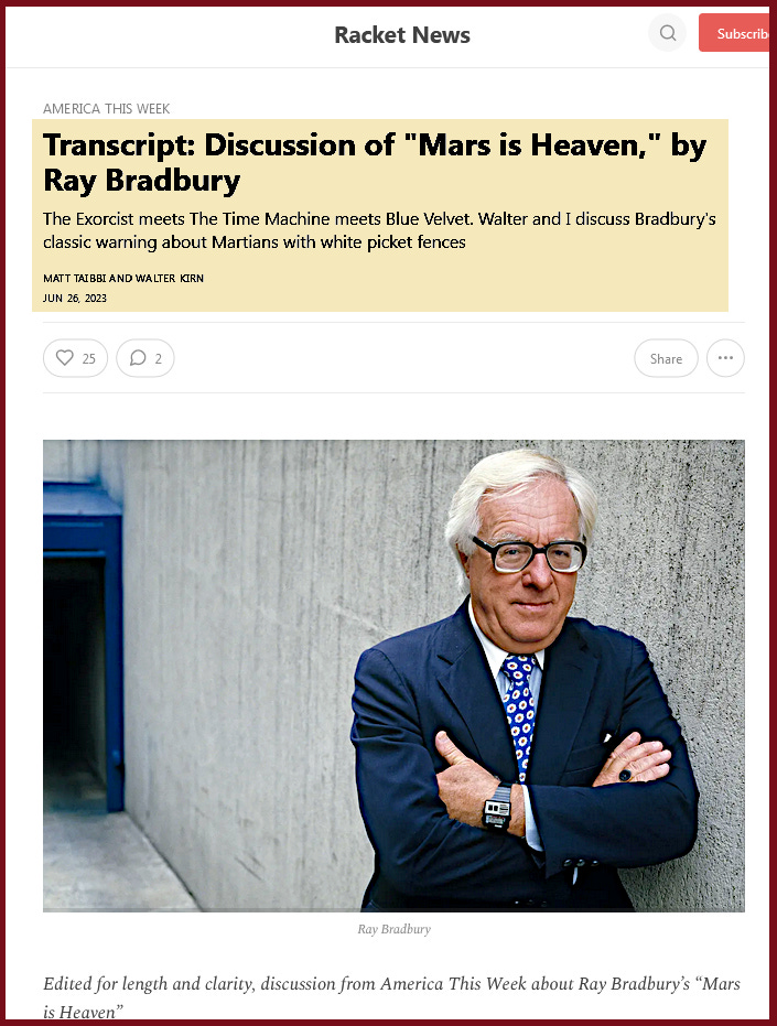 'The Exorcist meets The Time Machine meets Blue Velvet. Walter and I discuss Bradbury's classic warning about Martians with white picket fences' - Article