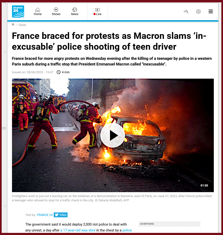 'France braced for more angry protests on Wednesday evening after the killing of a teenager by police in a western Paris suburb during a traffic stop that President Emmanuel Macron called "inexcusable".' - Article