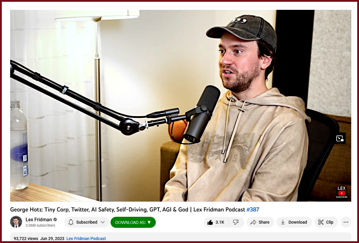 “George Hotz: Tiny Corp, Twitter, AI Safety, Self-Driving, GPT, AGI & God | Lex Fridman Podcast #387”