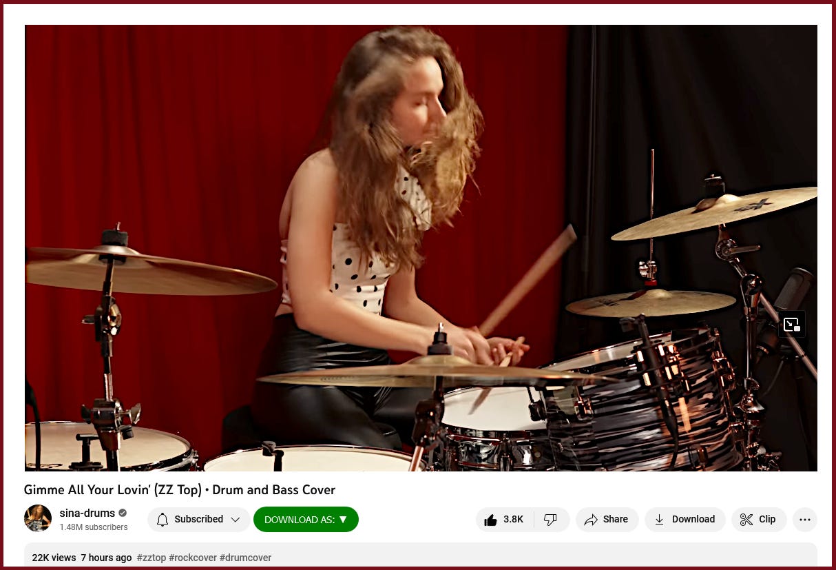 Looks like a technically simple piece of drumming, and she does with ease .. I include out of habit as much as anything .. wondering if those pants are leather – not likely but I know so little about such, and wondering if when she buys a new drum-set does she donate her least favorite to someone would is too poor, or if she has combined with others in her area to have a 'public' studio where those without could sign-up time and use it ..