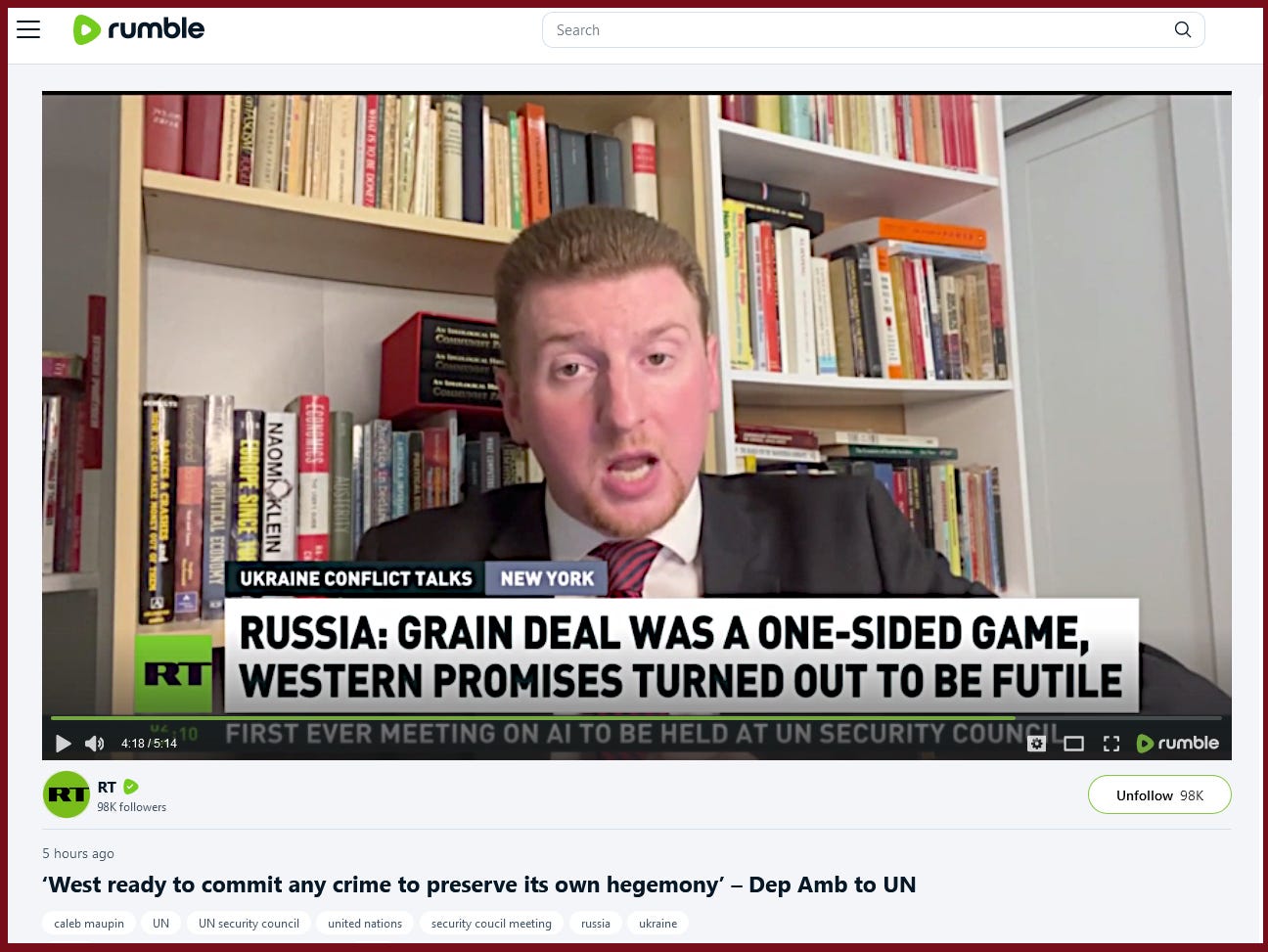 Part of the lies is the suppression of truth, and in much of the West the Russian Television (RT) has been made illegal to see on their networks, so clearly a lot of people should be fed into wood-chippers along with all the older women in their families as mind-raping false-witnessing interferes of our Freedom-To-Hear. { .. more comment following ..}