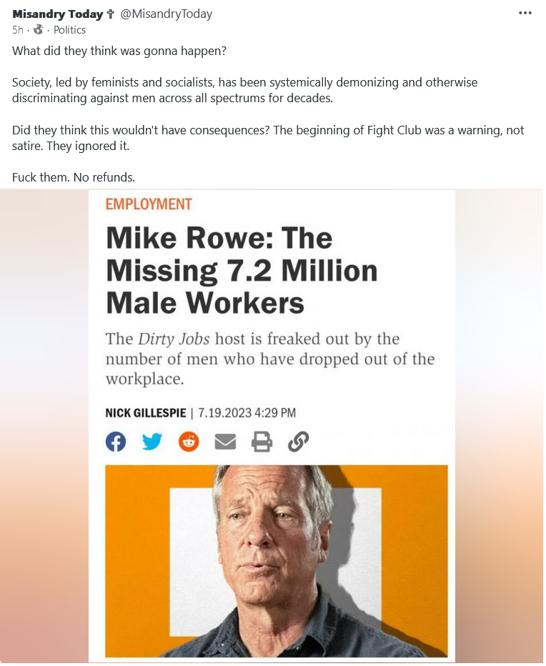 As one of millions of victims of Golden-Calf venture capital Satanic Witches systematic wage suppression, family destruction, genocide, .., so many years of under-pay ad struggle in a career that my father's generations supported large families in a middle class house and living standard – watching businesses not hire or replace workers but load the work on us, generations of fathers and men who worked themselves sick and unable to work for a family who's wives divorced and took children, a ruling elite who used tax and public resources to reward corporations to move jobs overseas, ...