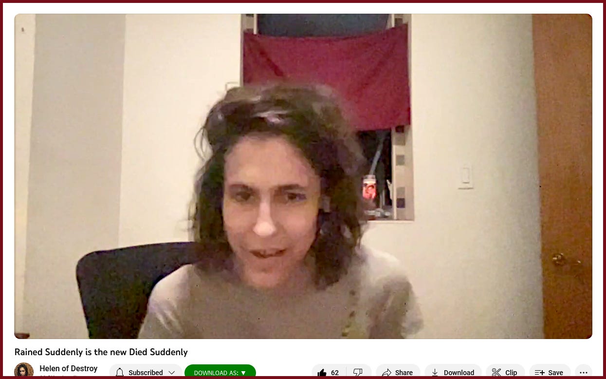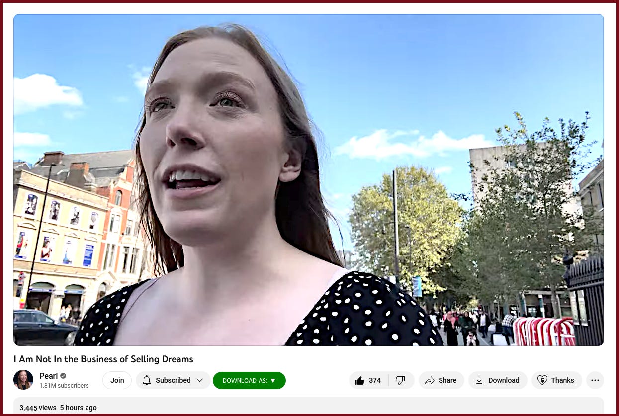 Another video from Pearl, some rambling and it strikes me that since she lacks those cute puffie-eyes women like her have when they climb out of bed – she is likely on her 2nd or 3rd cup and-or been awake and active for hours, make-up and such.