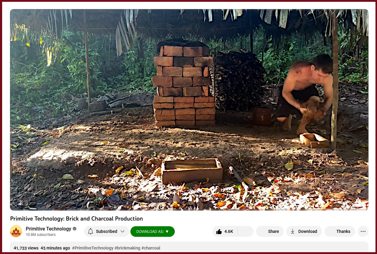 From video Description, 'In this video I use the thatched hut to fire bricks and make charcoal in for the first time. To make and fire bricks, a workspace protected from the rain must be made to protect the bricks from dissolving before they are fired. Built in a previous video, the hut was used as a space to fire the bricks. The firing went well with no issues with the thatch catching fire due to the height of the roof above the kiln. In addition to the hut being a place to make bricks, I made a charcoal mound in the space left over to make charcoal, a fuel for smelting iron. I had a previous charcoal mound out in the weather but the rain was an issue keeping the wood damp before getting a chance to fire it. So I made a 75 cm diameter re-useable charcoal mound and it produced 6 and a half pots of charcoal.'
