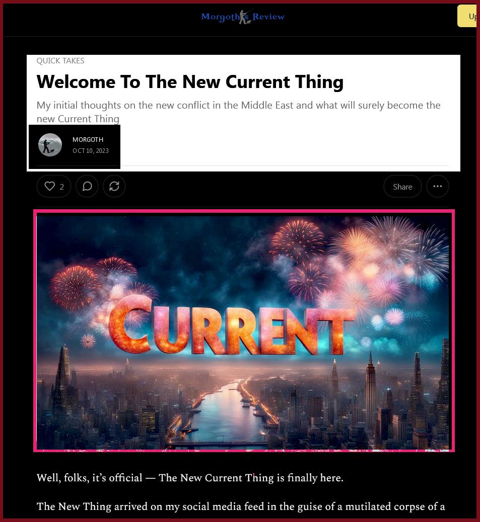'My initial thoughts on the new conflict in the Middle East and what will surely become the new Current Thing' – Article