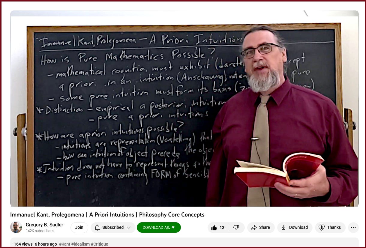 Another good chunk of Philosophy material presented well by Prof. Sadler – on Kant., ..