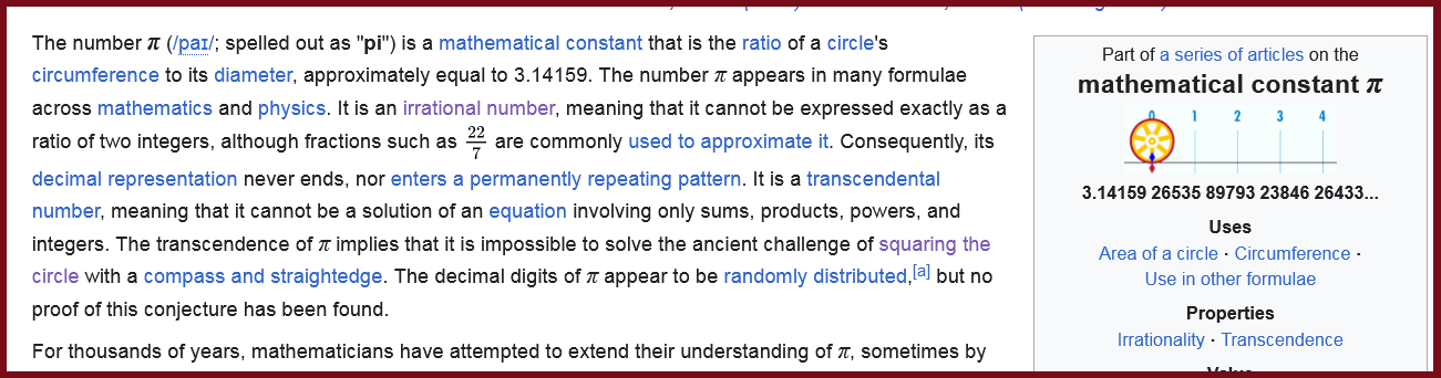 I mention this because in a Future Multiverse Past such information would be easy to arrange for Mr. Lutinski (Sp?) to have in his memory to be able to recall and convey .. we talked about and I implemented the use of random (x,y) pairs and percentage falling within the Unit Circle, but he was ignorance to all those algorithms which I wanted to know, and not just for Pi but how the computer and my primitive hand calculators (TI-58/59, HP-41CV series that I work construction related jobs in summer and saved money to buy)