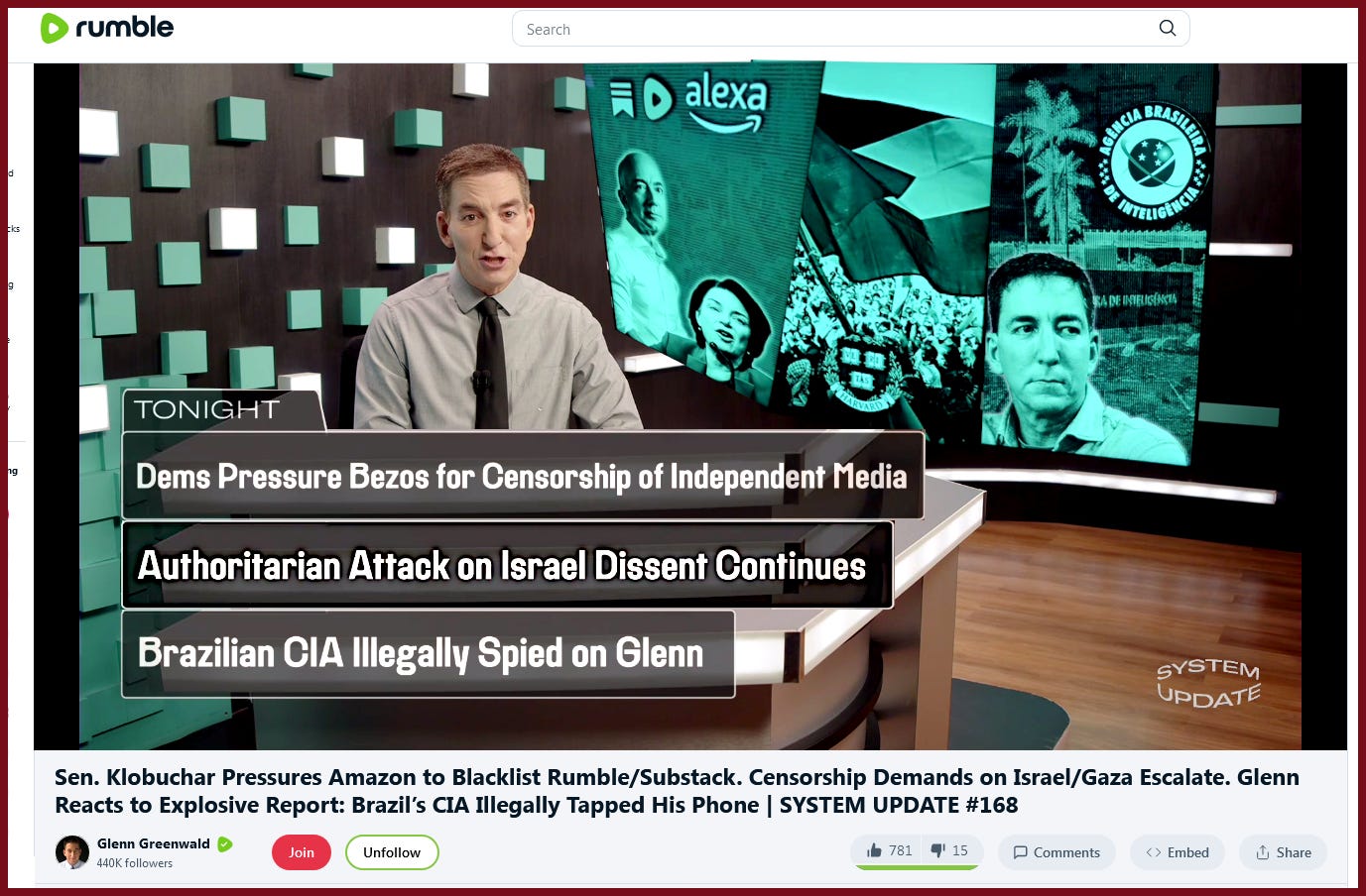 “Sen. Klobuchar Pressures Amazon to Blacklist Rumble/Substack. Censorship Demands on Israel/Gaza Escalate. Glenn Reacts to Explosive Report: Brazil’s CIA Illegally Tapped His Phone | SYSTEM UPDATE #168”