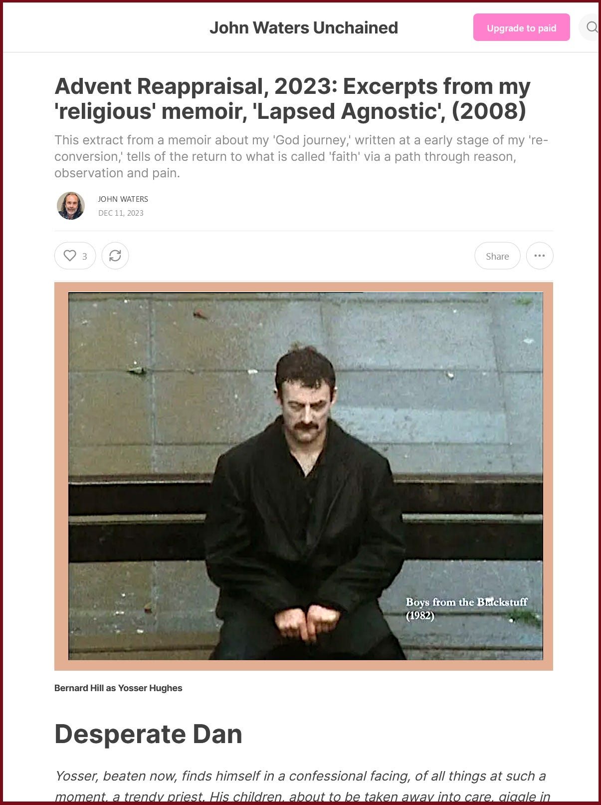 A religious Reflection from John Waters – a glimpse into aspects of Ireland and creeping Modernism and raised in Talmud-Sickened twisted Western damaged society of 'flower-power' drugs sex and a Catholic Church with sad poor 'modernists' Sickened Priests, and related., ..