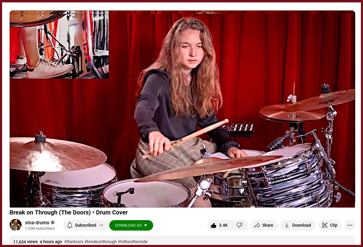 This one seems Fun. I enjoyed watching the drumming, the striking the edge and such. I wonder how she knows how to do those extra things – if she has access of video of the original drummer, or what.