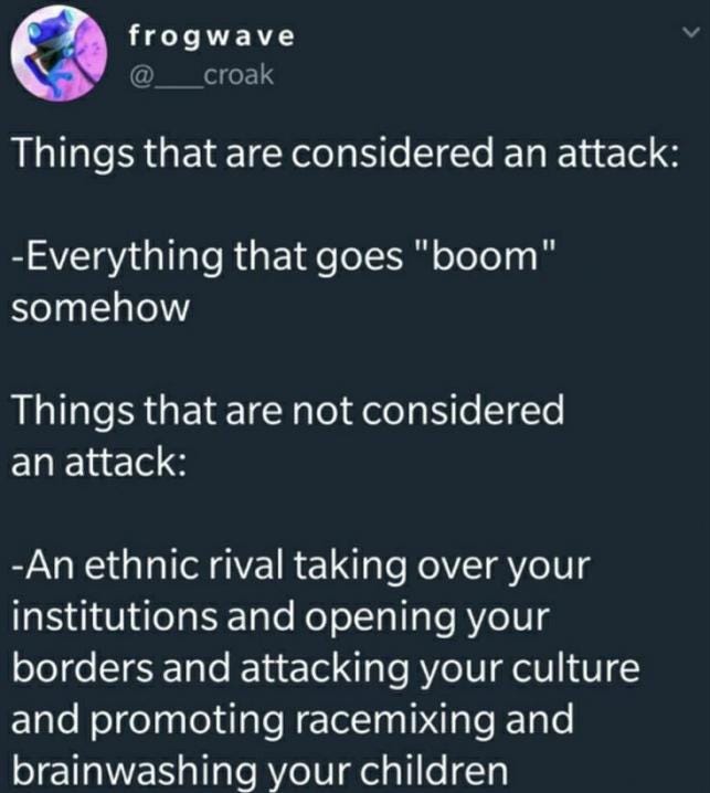 Of course he's point of how selling war, death, suffering, horror, destabilization is correct, that it is anti-Life, Anti-Christian, Satanic inspired excuse. It is not only they kind of Talmud-Sickened vileness of clearness (to anyone who's brain is not broken with baby-murdering and excusing) but is disgusting in so many ways – and such logic should reasonably bring the listener who hears it to want such people gone from them and anyone they love or might love, a dangerous Demon-Possessed person and likely everyone they connected too are same. Shame .. what happened to Shame of being sub-human murder pushing nightmare?