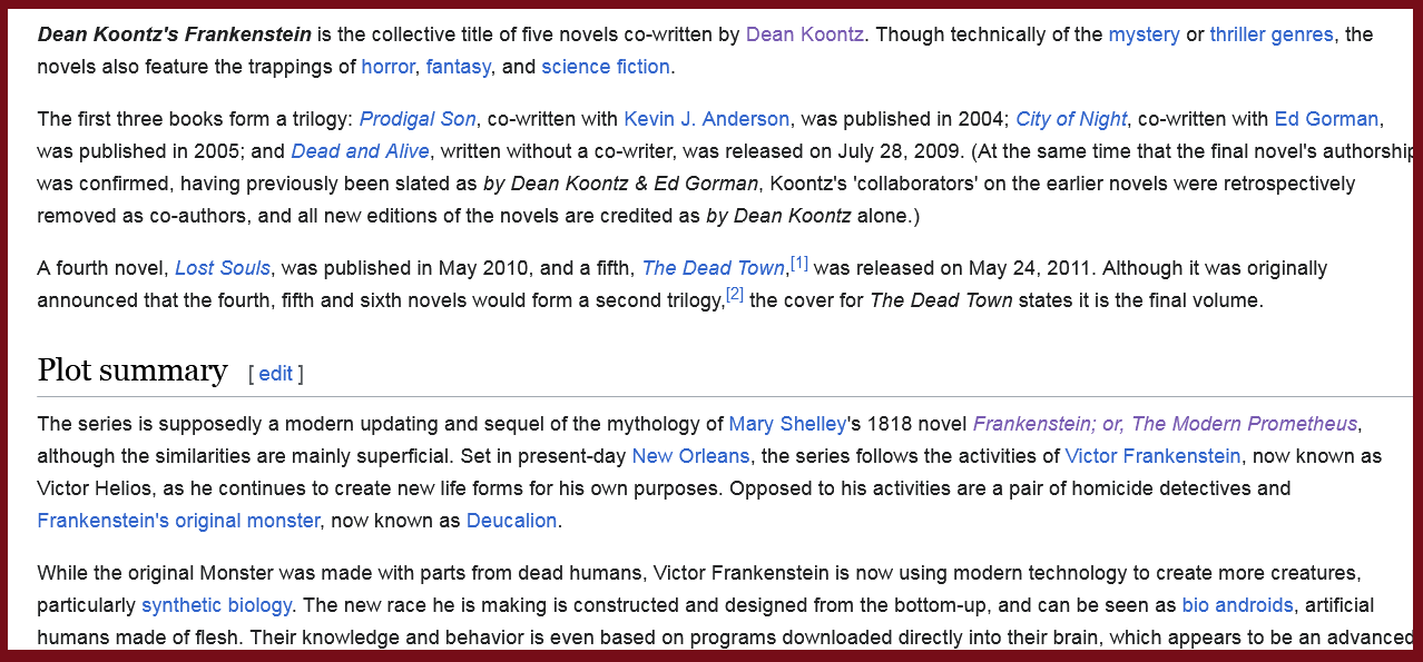 I have been re-listening to Dean Koontz's 'Frankenstein' (Archive: https://archive.is/5Q3Ry ) series ..