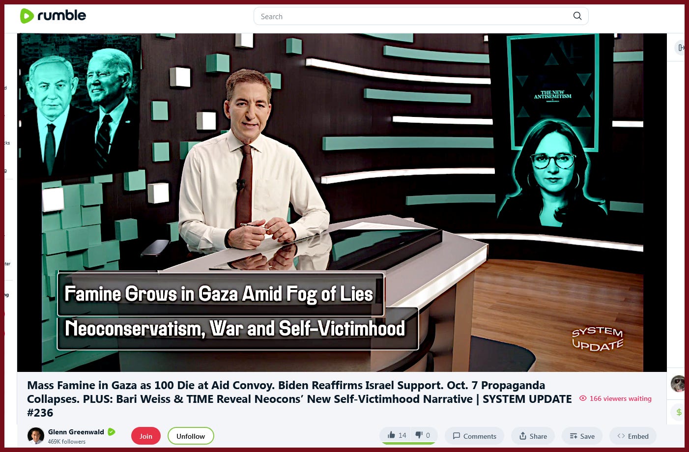 “Mass Famine in Gaza as 100 Die at Aid Convoy. Biden Reaffirms Israel Support. Oct. 7 Propaganda Collapses. PLUS: Bari Weiss & TIME Reveal Neocons’ New Self-Victimhood Narrative | SYSTEM UPDATE #236”
