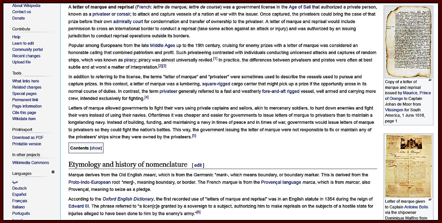 About my modified 'Letters of Marque' (Archived: https://archive.is/BcwFZ ) suggestion mentioned above comment.